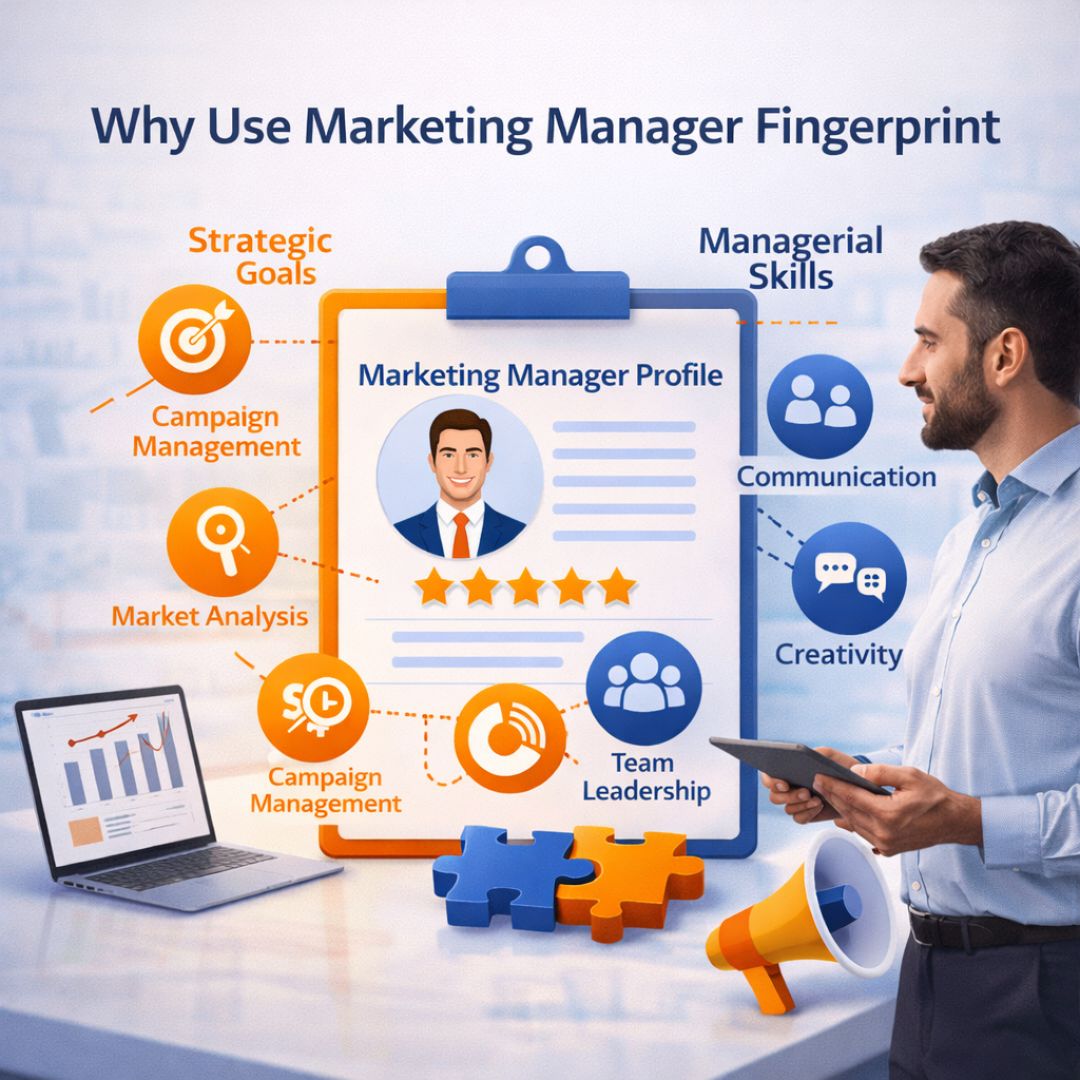 The Marketing Manager Fingerprint helps organisations identify individuals who can lead marketing initiatives while managing teams effectively.