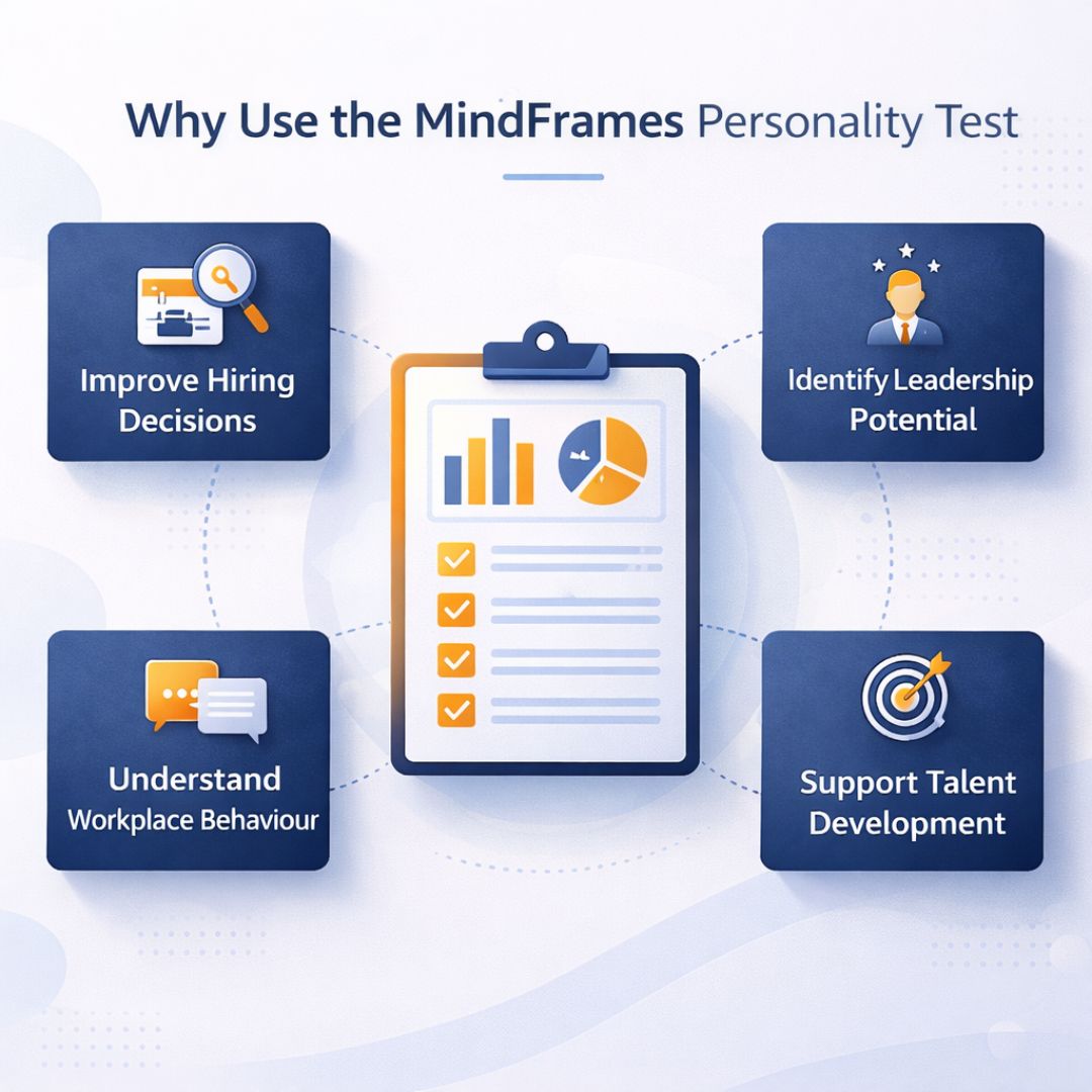 MindFrames is a scientifically designed psychometric assessment that evaluates the personality traits shaping how individuals think, behave, and perform at work. It provides insights into behavioural patterns that influence leadership, decision-making, teamwork, and professional growth